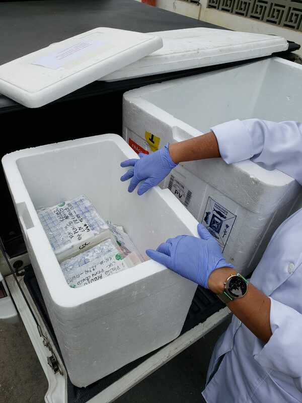 A color photograph of frozen samples being transported in coolers to testing labs as part of a study of Gamma variant of the SARS-CoV-2 virus conducted in Manaus, Brazil.